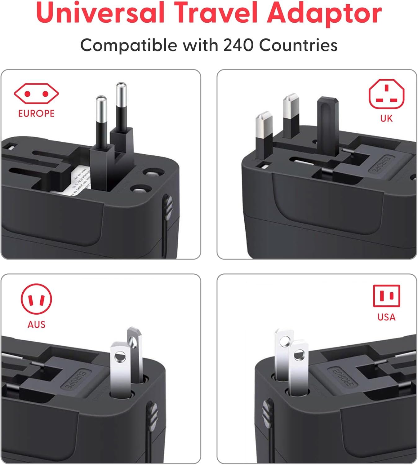 【Universal Worldwide Charging】This travel adapter accepts plugs from More than 150 Countries with US/EU/UK/AU European Plugs like Thailand, New Zealand, Israel, Italy, Rome, France, Spain, Canada, China, Australia, India, Hong Kong, Argentina, Peru, Korea, Asia, etc.