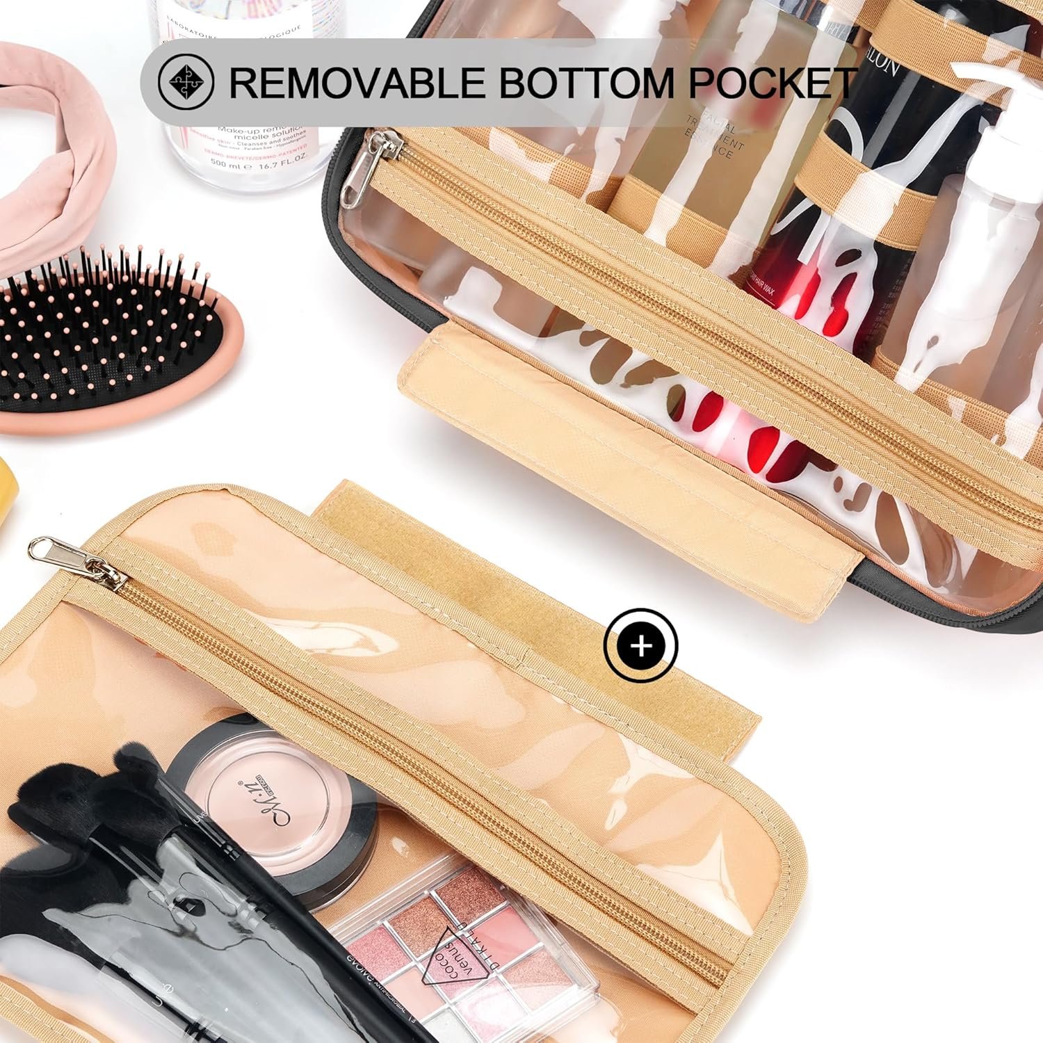 CONSIDERABLE DESIGN – The elastic bands inside the two main compartments can keep the different height bottles fixed and upright. Your comb, toothbrush, razor, and leak-prone makeup can all go in there, even a hair dryer. 360° metal hook gives you a variety of hanging options.