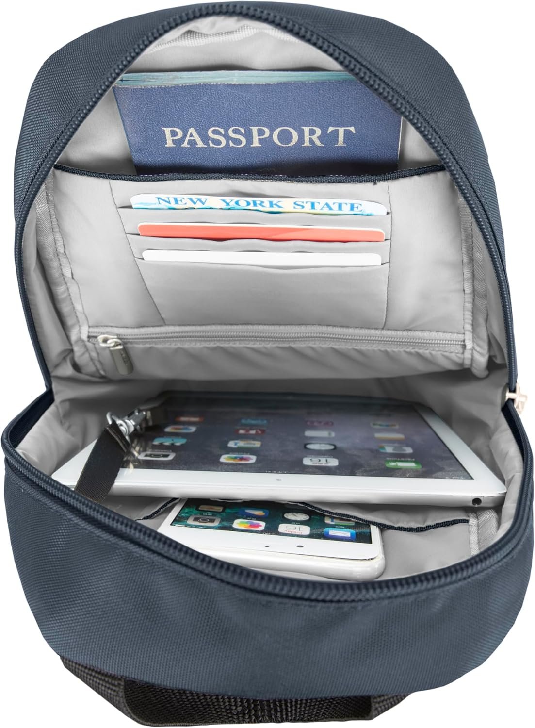 5-Point Anti-Theftsecurity system. Main compartment has organizer panel, slip pockets and zippered pocket. Locking compartments and slash-resistant construction