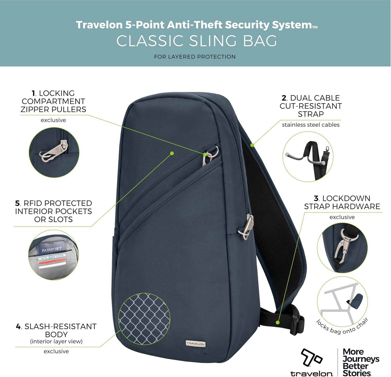 No other Anti-Theft bag collection enjoys higher customer loyalty than Travelon Classic. From timeless and versatile design, colors to pair with any wardrobe, quality materials and craftsmanship to discreet security features and thoughtful organization. The Classic Sling is designed to carry more and keep more items organized more than everyday bags. Lightweight, durable polyester. Now you can stop watching your bag and look up to see the world in front of you. Our built-in 5-Point Anti-Theft security system will protect your valuables from pickpockets and thieves. Includes slash-resistant mesh barrier in all 4 sides and bottom body panels; slash-resistant and lock-down strap; locking compartments; and RFID blocking organizer. Travelon packs your bag with peace of mind.