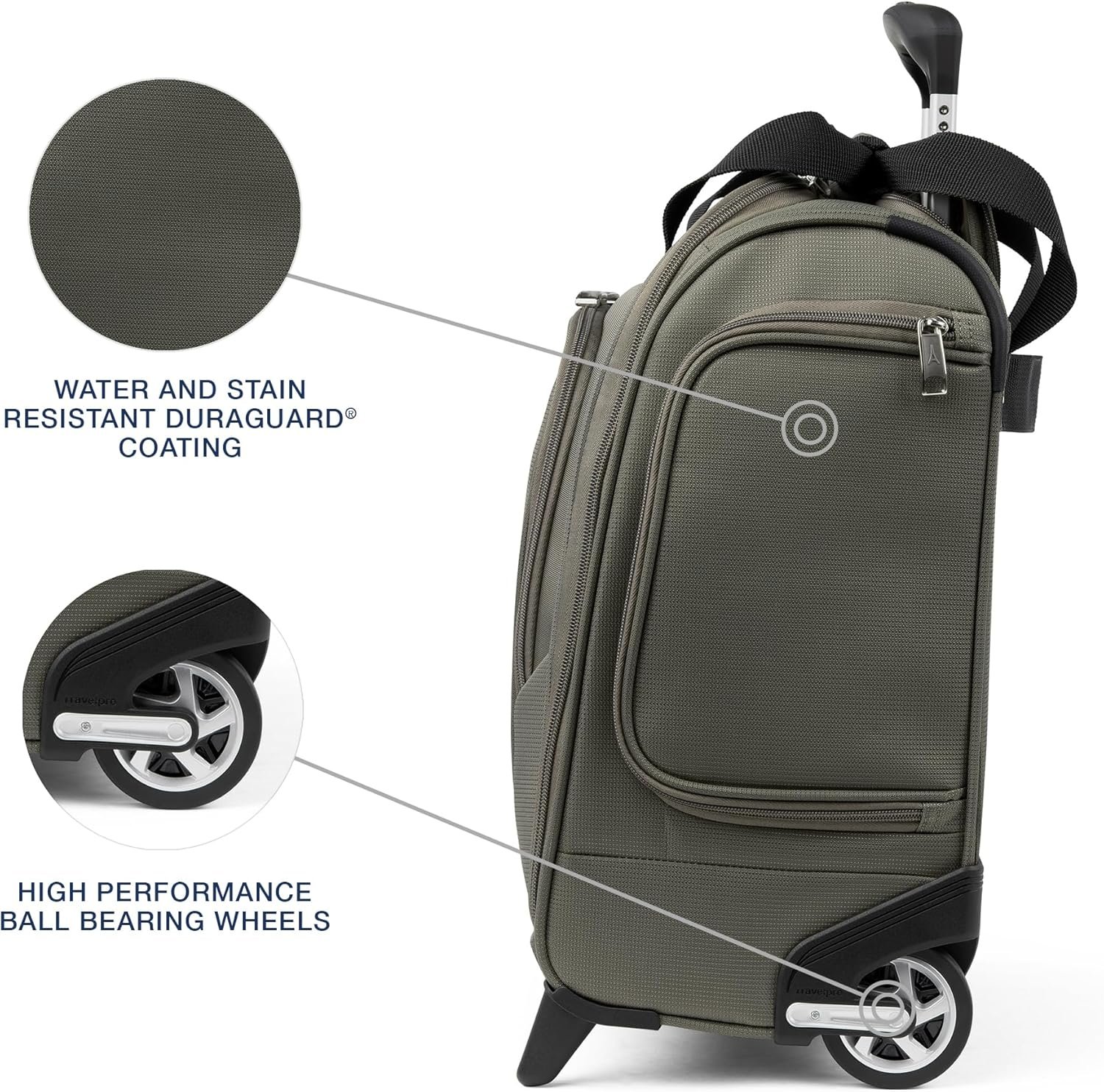 Compact, wheeled underseat carry-on bag is designed for organization, mobility and convenience. Polyester fabric with stain-resistant, water-repellant duraguard coating and ergonomic, high-tensile-strength zipper pulls provide lasting durability.