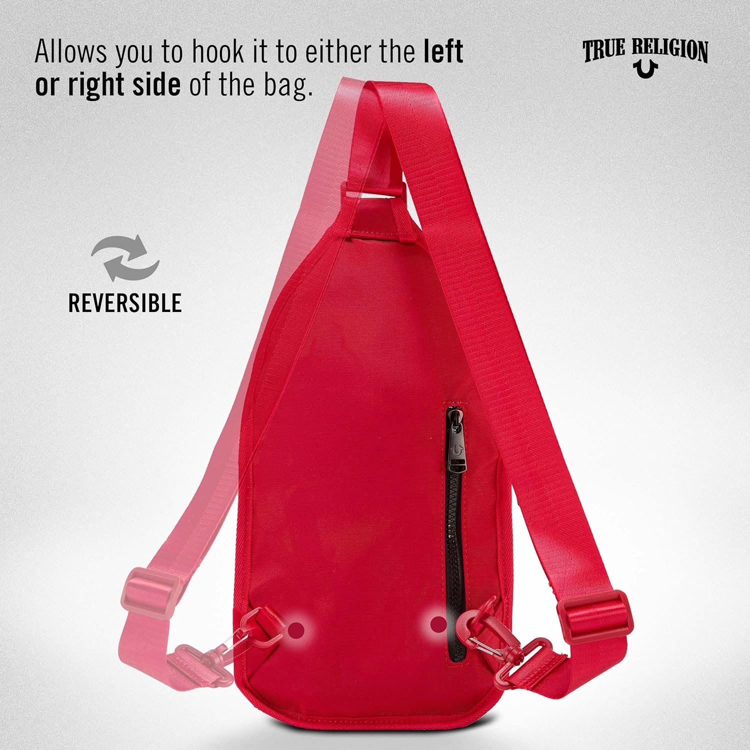 Reversible strapLarge main pocketDurable metal zipperHook for keysInner card holder sleevesSmall front pocketSmall back zipper