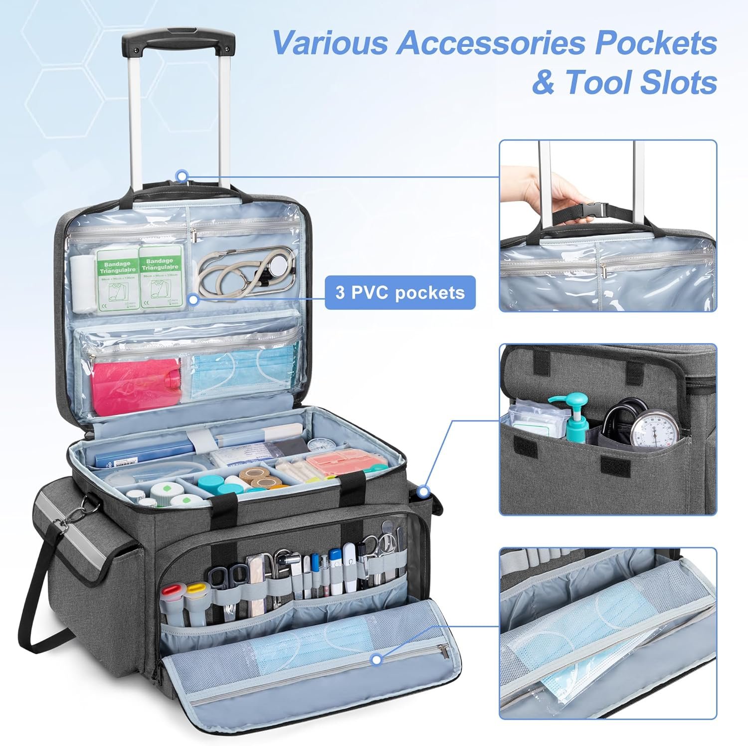 Large space for carrying all the first aid kitsThis medical bag with wheels effectively reduces the heaviness when carried outVarious pockets and slots help neatly organize the different tools and supplies Great for home emergency kits storage