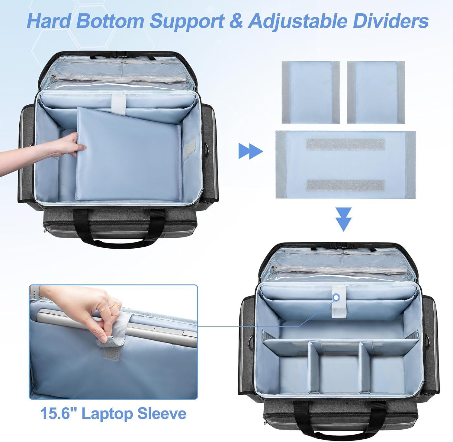 【Intelligent Organization System】 Main compartment includes 3 adjustable dividers to configure 2 or 4 tailored storage spaces, a dedicated 15.6” padded laptop sleeve, 3 transparent zippered top-cover pockets for quick access, a front zippered pocket with a large mesh pocket and elastic loops with bottom slots, plus two side pockets with touch fastener closure for extra organization.