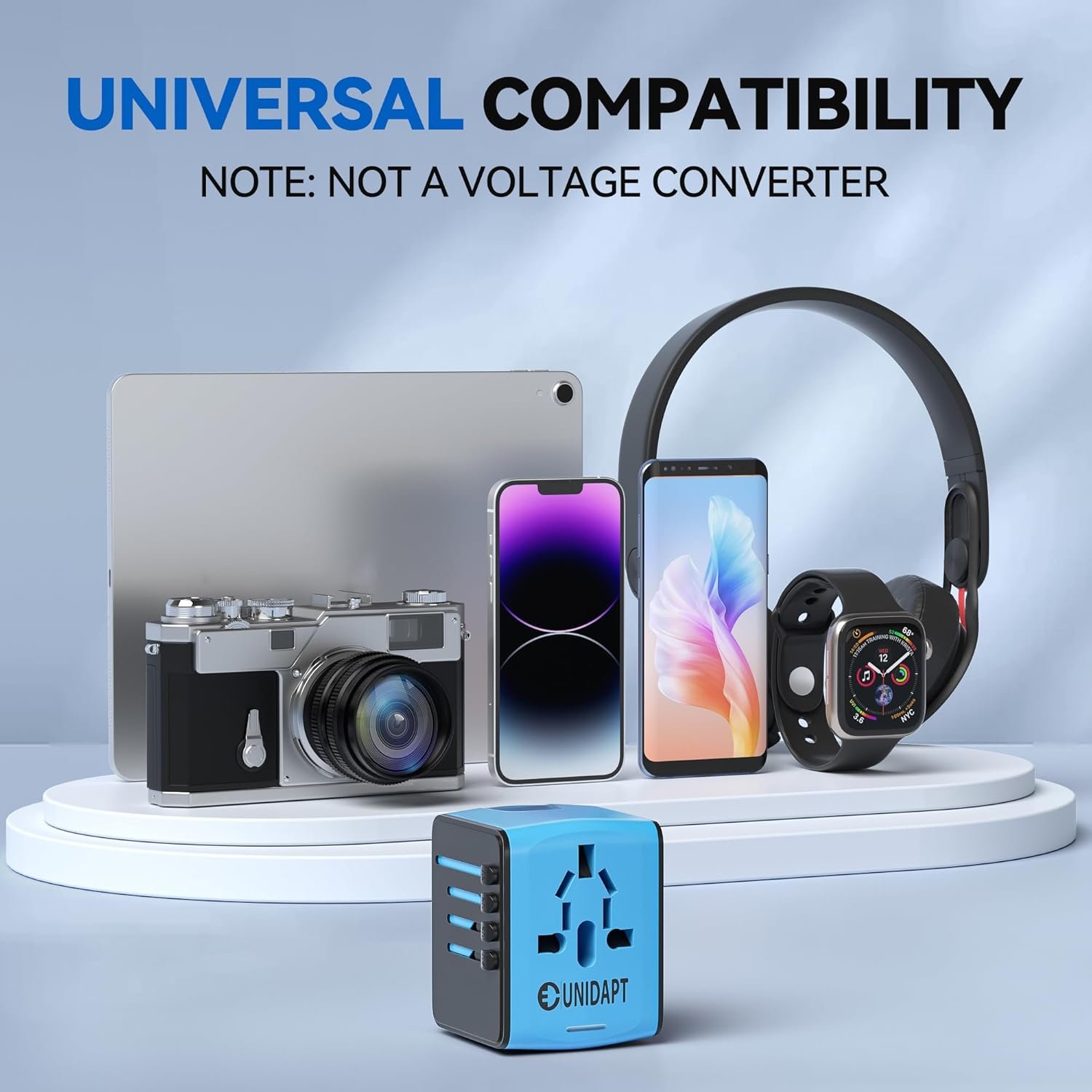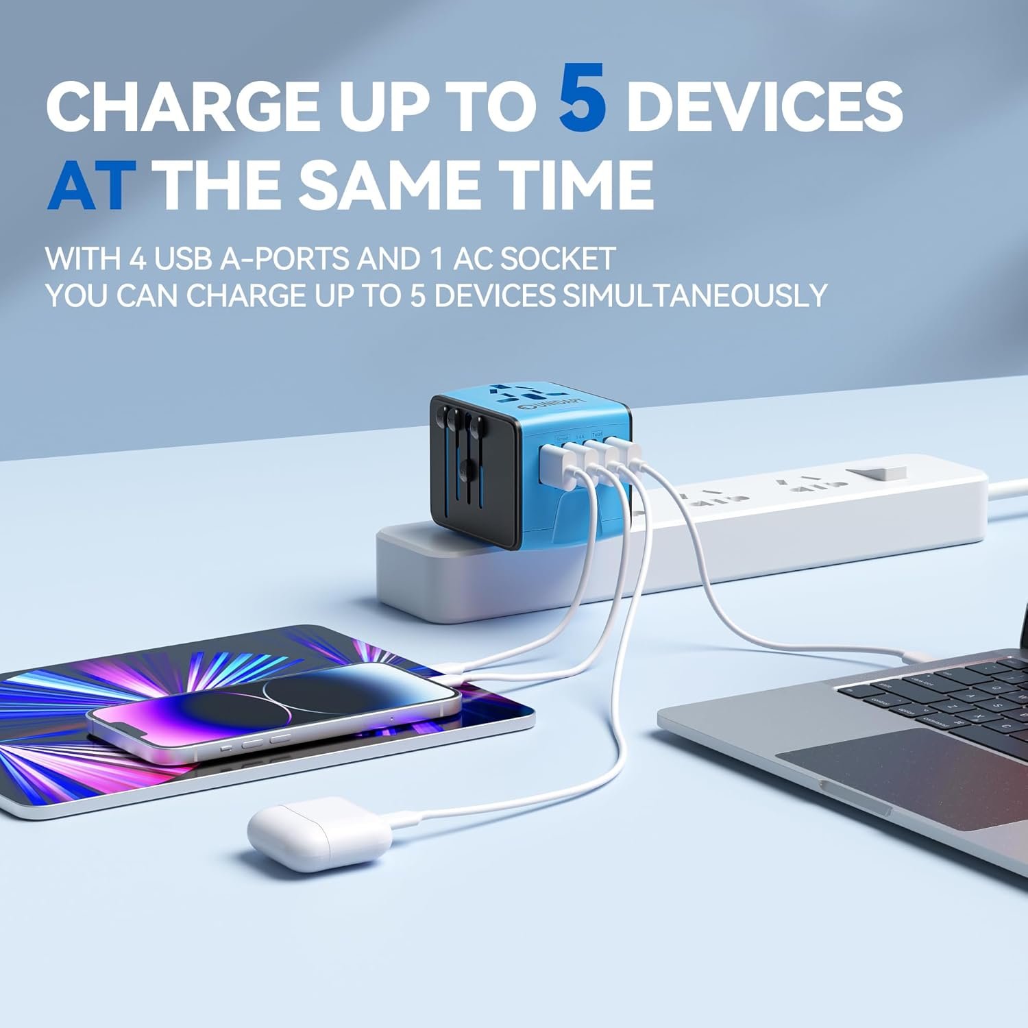 CHARGE UP TO 5 DEVICES: The Unidapt Travel Adaptor allows SIMULTANEOUS use of the AC power Socket and Four USB CHARGING Ports. It is compatible with devices such as: bluetooth speakers, head phones, power banks, phones, tablets and so on.