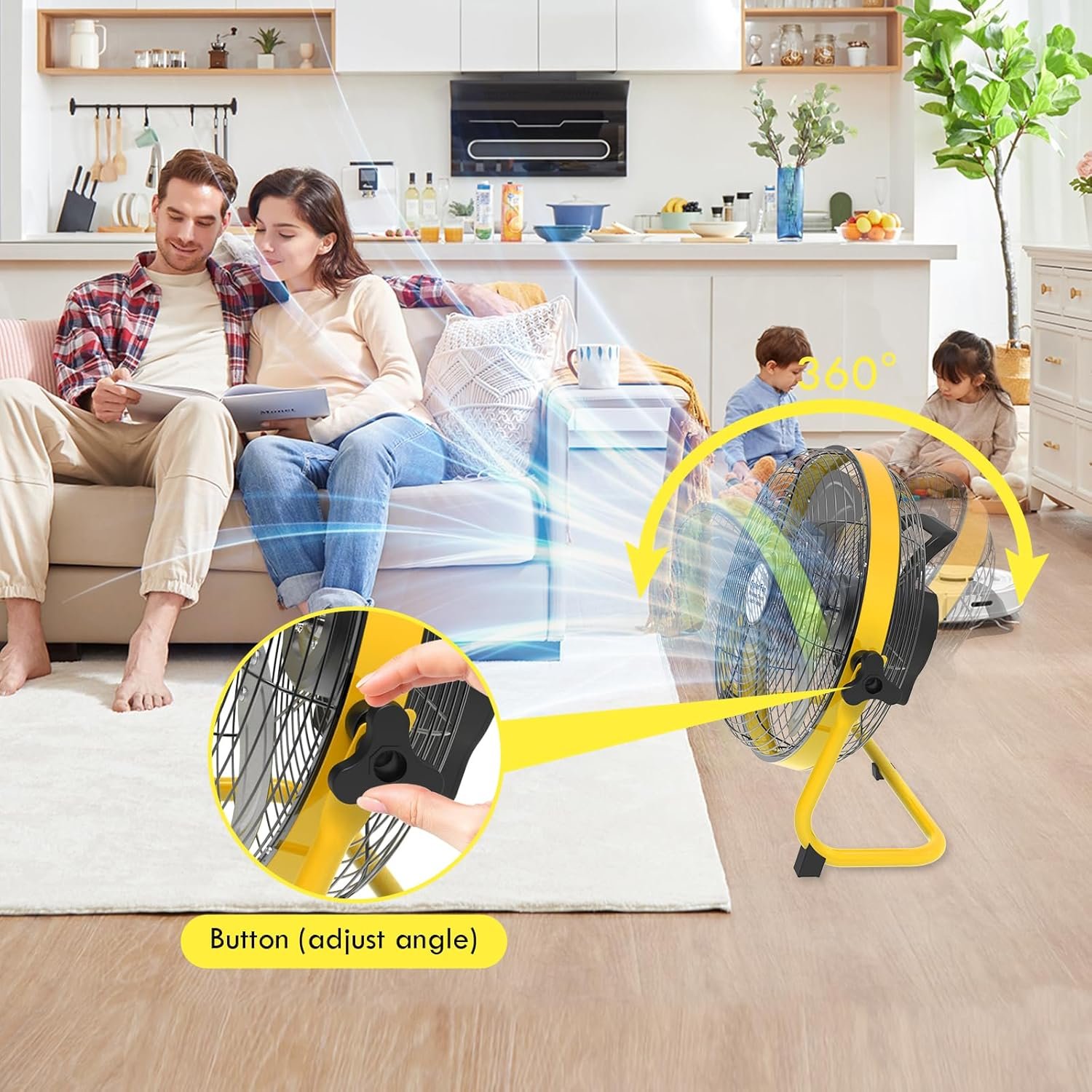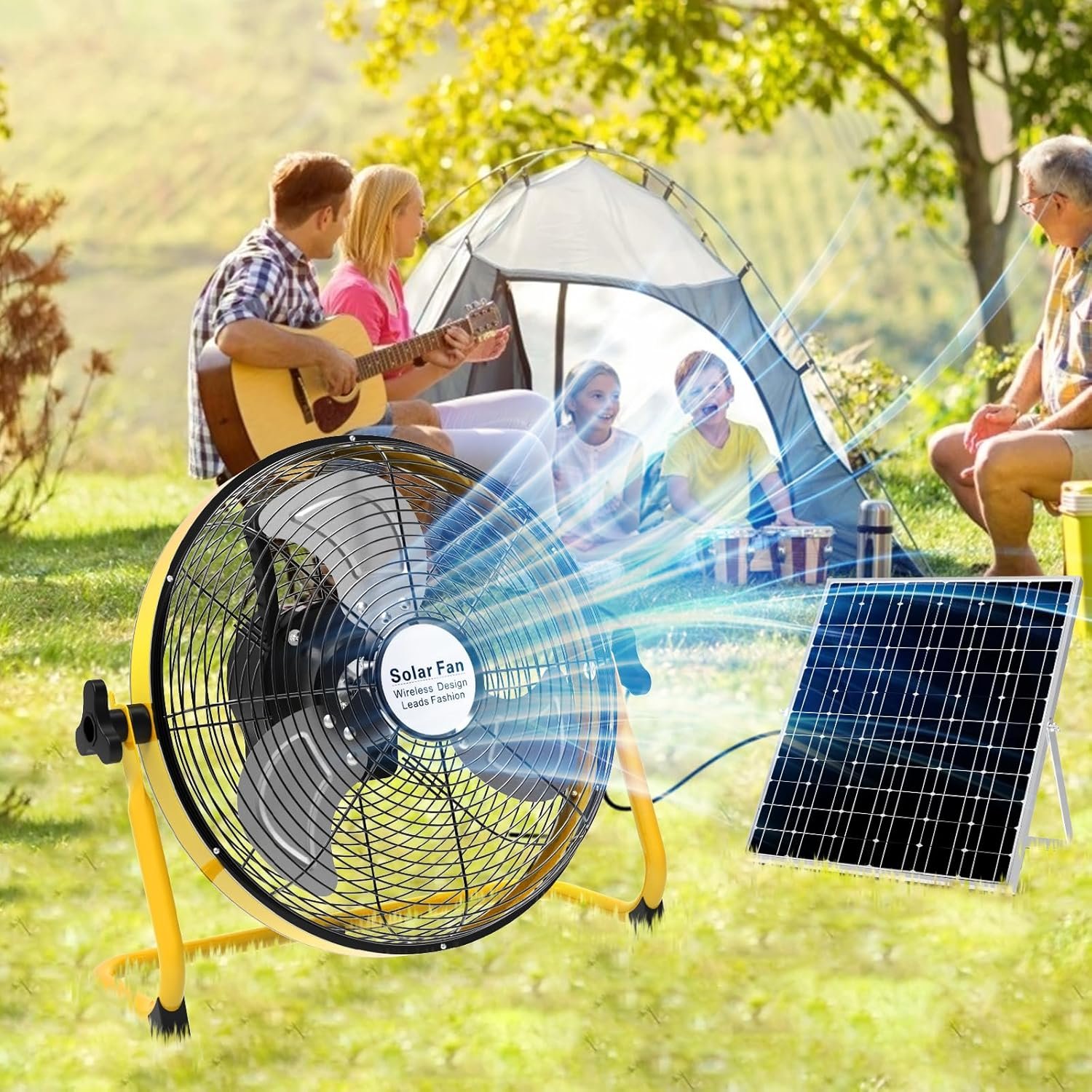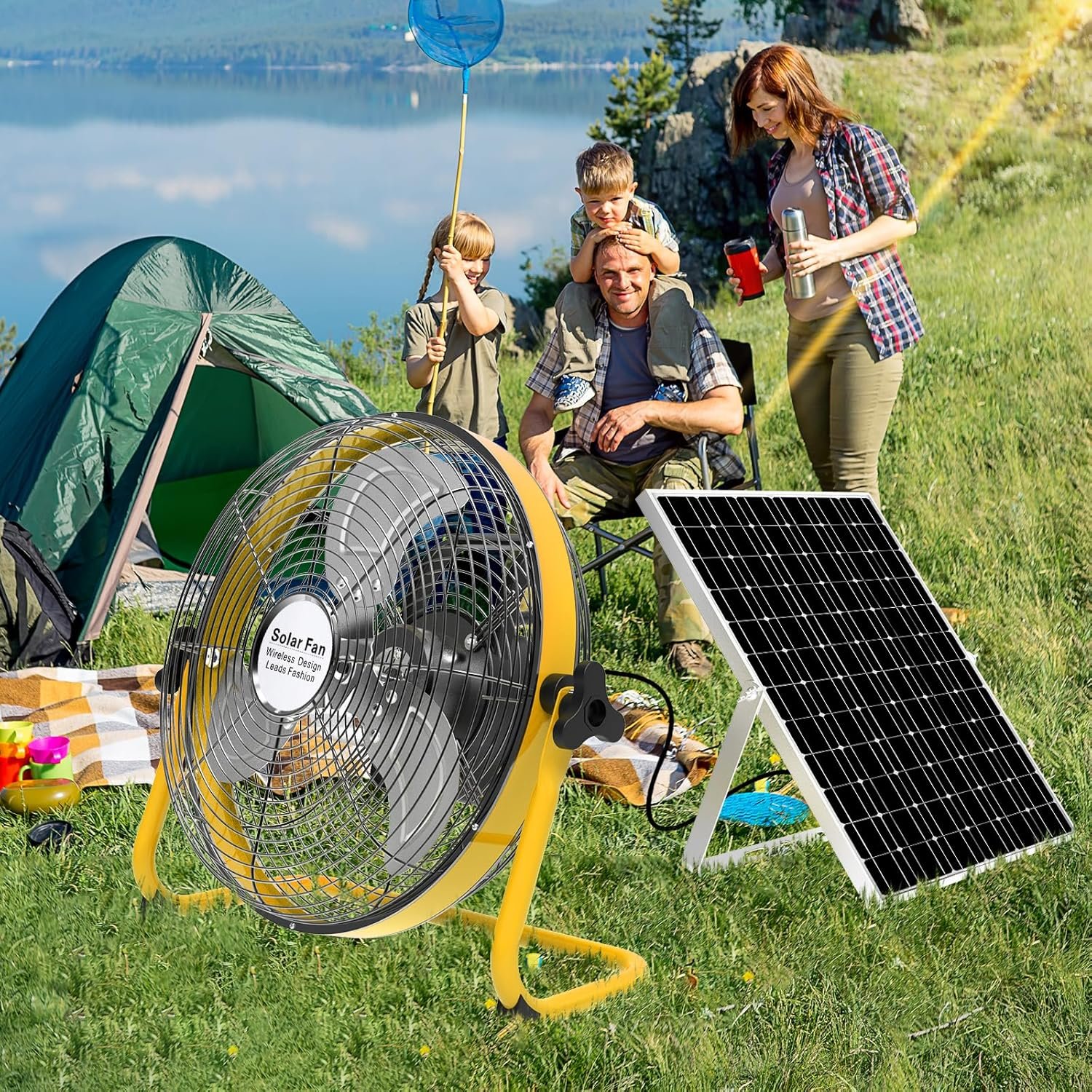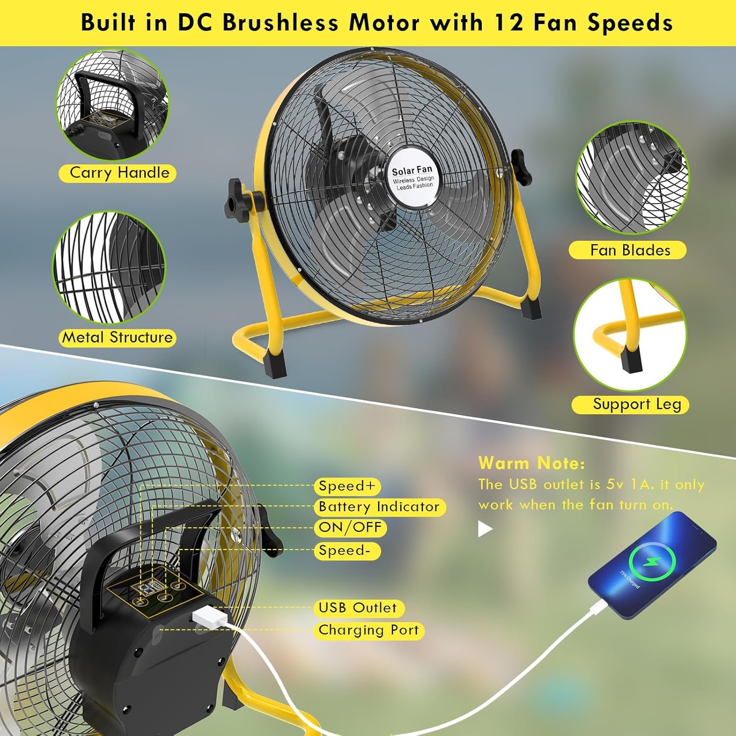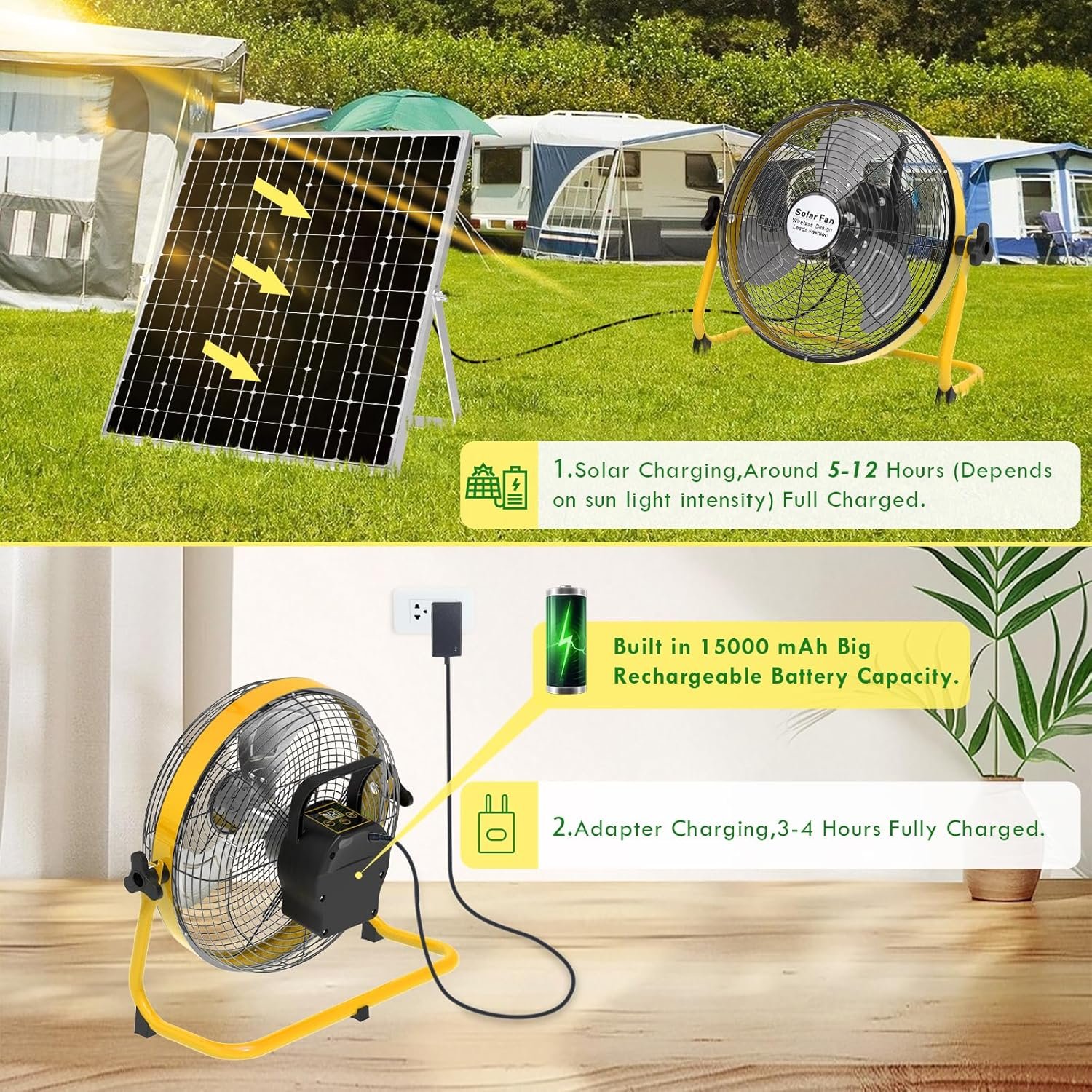 Upgraded 14 Inch Outdoor Solar Powered Floor Fan Rechargeable,15000mAh Battery Portable Cordless Fan with Solar Panel AC Charger,12 Speeds Blades Table Fan for Camping, Garage, BBQ, Fishing (Yellow)