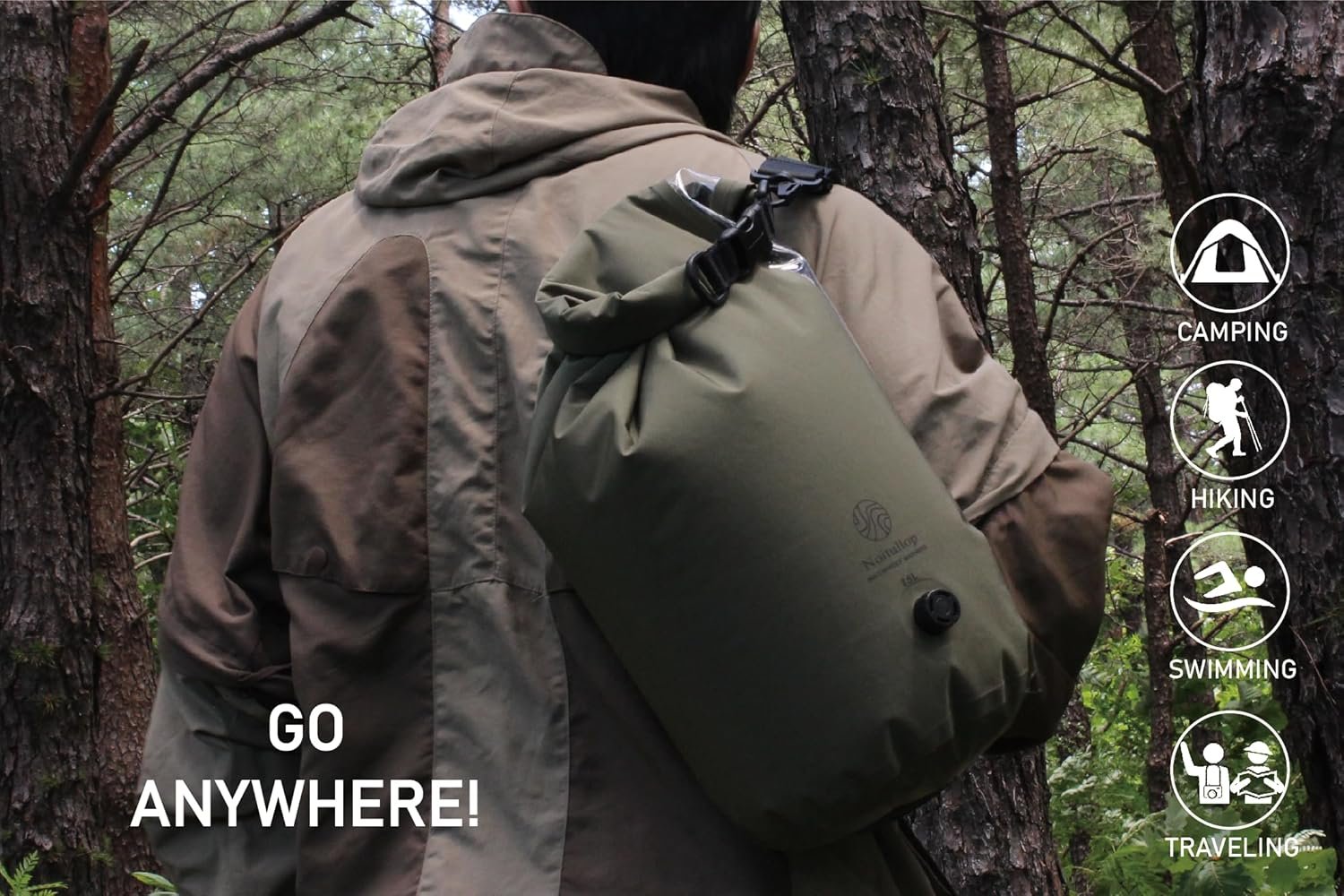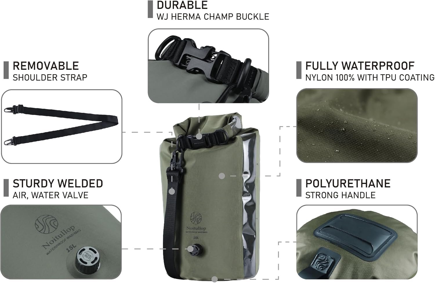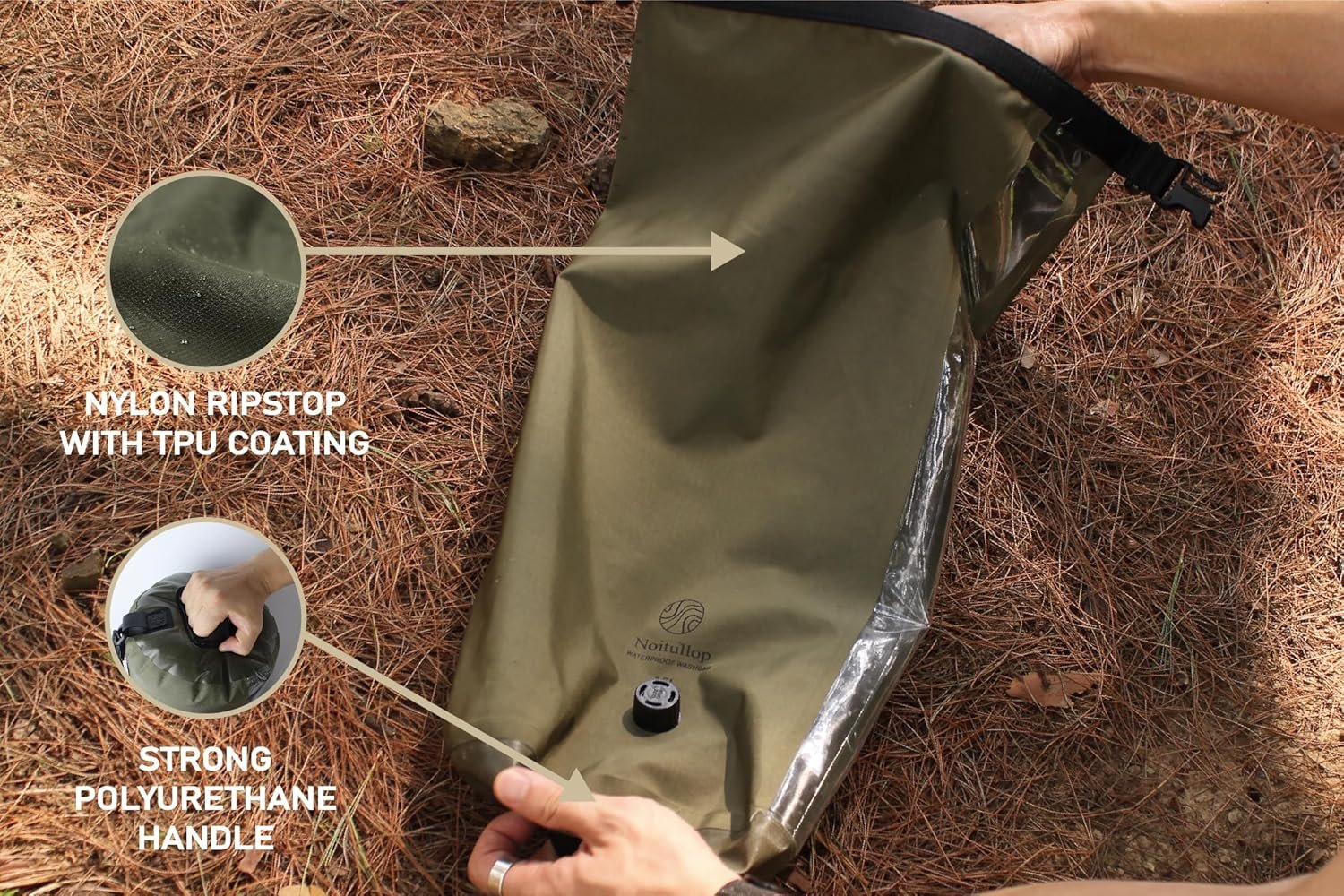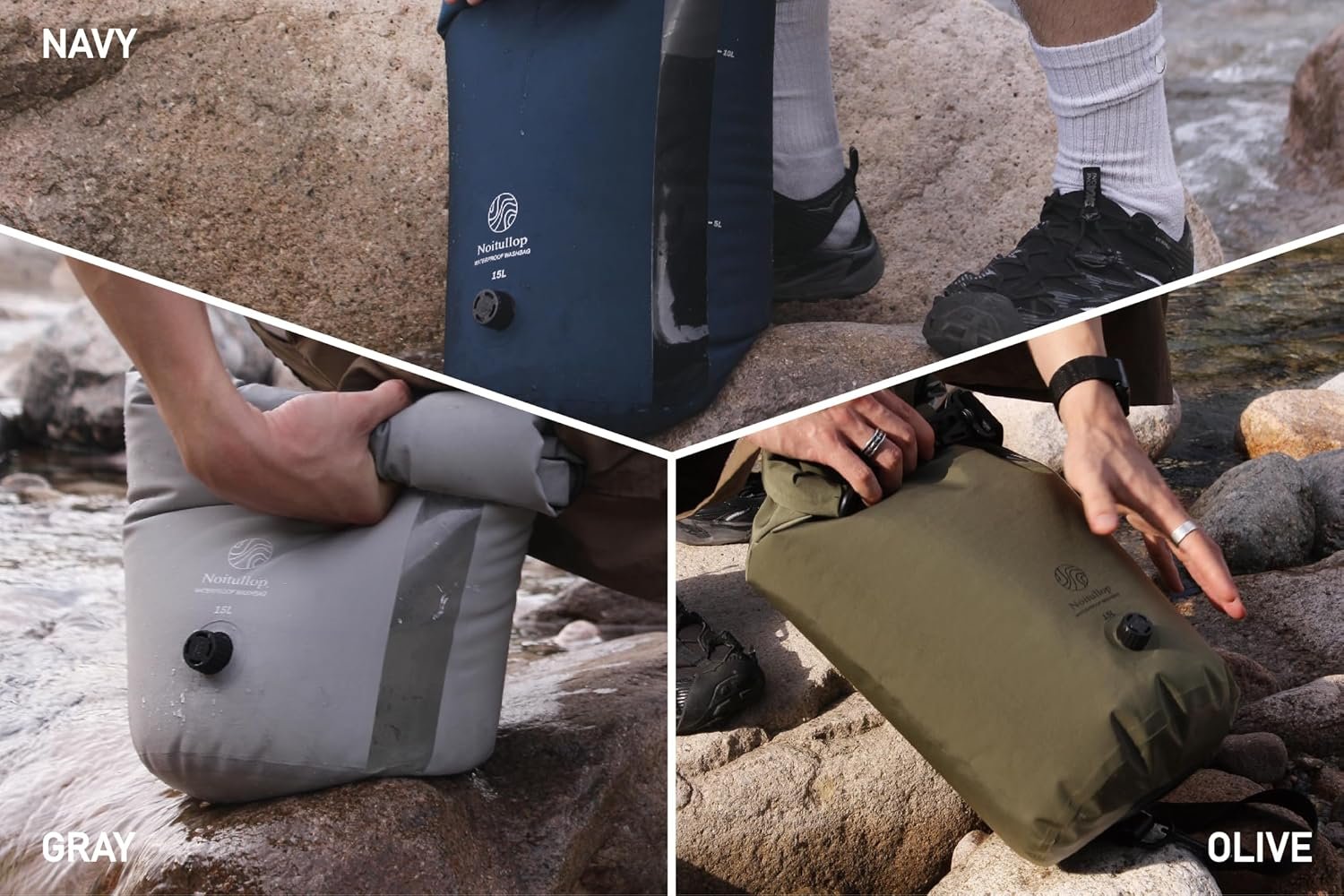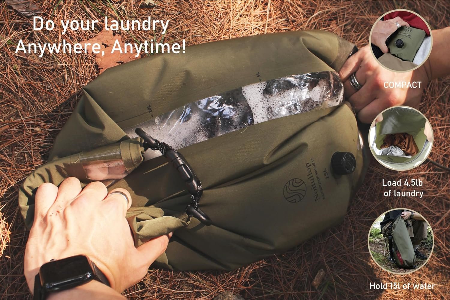 Portable Washing Machine: This lightweight, compact 15L dry bag doubles as a manual washing machine for travel, camping, or swimming.
