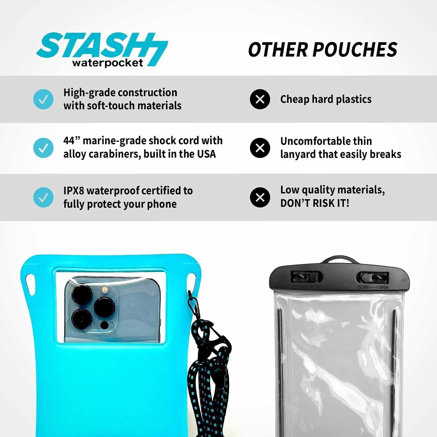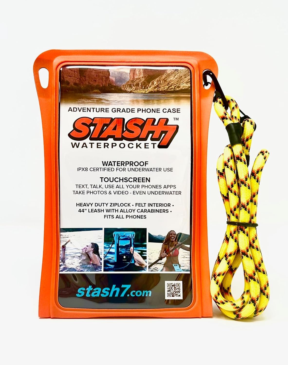 44″ SHOCK CORD LANYARD: the Stash7 Waterpocket waterproof phone bag features the one and only Stash7 Leash: a rugged 40″ UV and abrasion resistant, nautical grade shock cord with a sturdy alloy spring loaded carabiners letting you securely clip, loop or tie your phone pouch in any way you want to your life jacket, belt, backpack, swimsuit, or whatever gear your taking on your next adventure