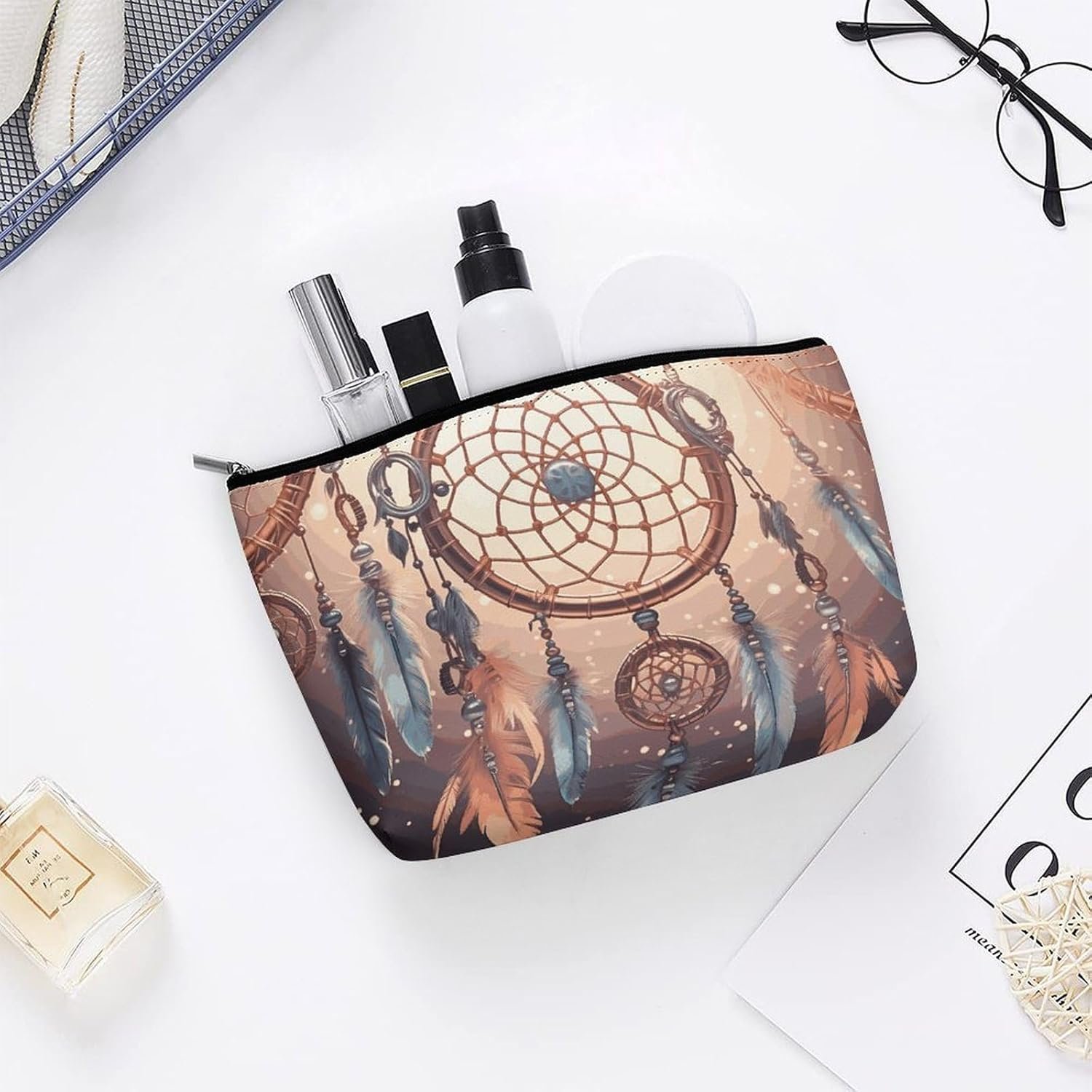 Ideal Gift: The Native American Dream Catcher Waterproof Make up Bag Is Absolutely the Best Gift for Friends, Family, Or Colleagues. Native American Dream Catcher Small Makeup Bag for Purse Is the Perfect Gift for Makeup Enthusiasts Who Are Always Traveling for Business, Adding Color and Convenience to Their Daily Beauty Routines