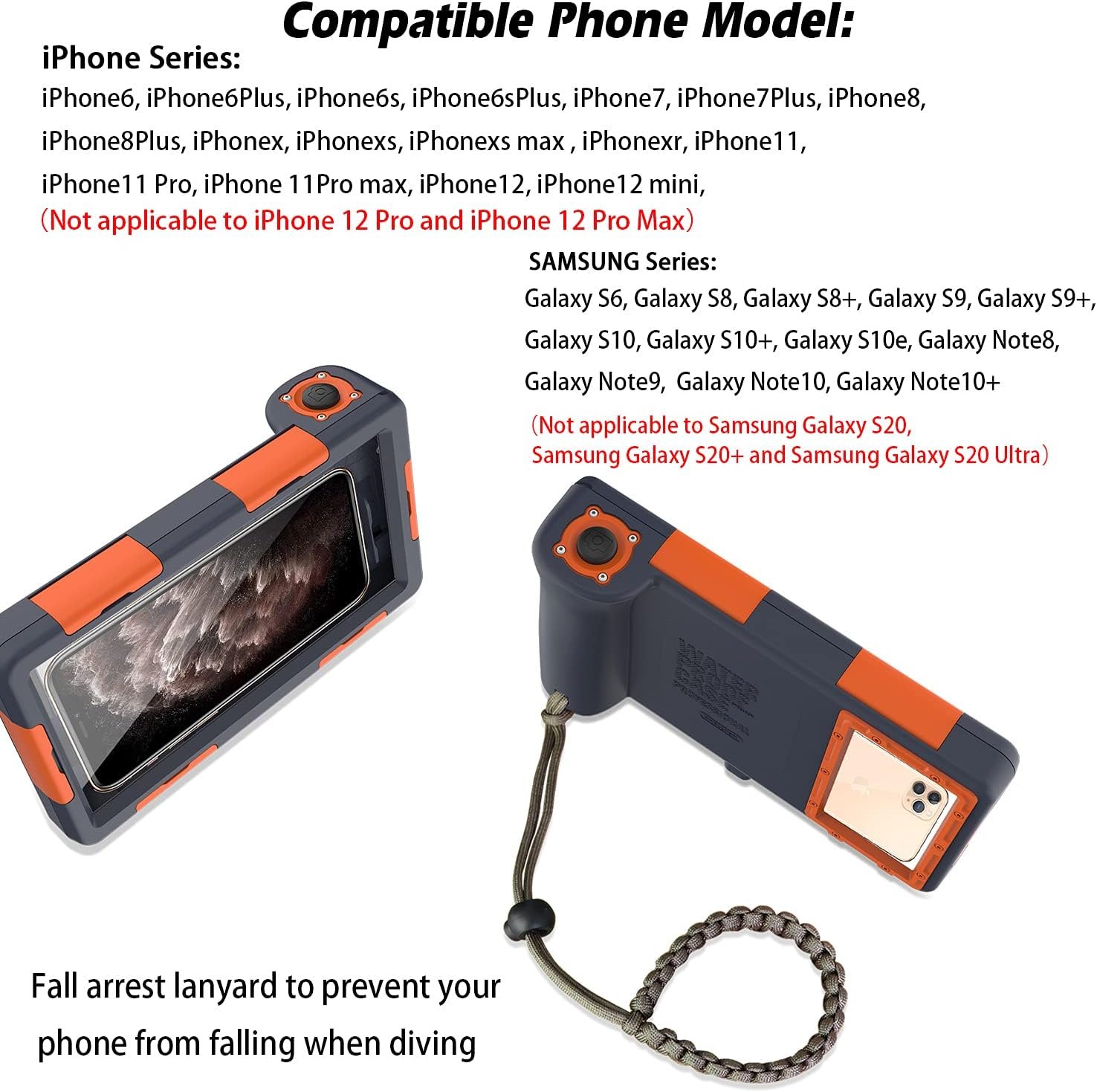 【Compatibility】Compatible with Apple series iPhone 6/ 6 Plus/6s/6s Plus/7/7 Plus/8/8 Plus/X/Xs/Xs Max/XR/11/11 Pro/11 Pro Max/12 Mini/12 and Samsung series Galaxy S6/S8/S8+/S9/S9+/S10/S10+/Note 8/Note 9/Note 10/Note 10+. Make sure your phone model is suitable for our diving case before purchasing.
